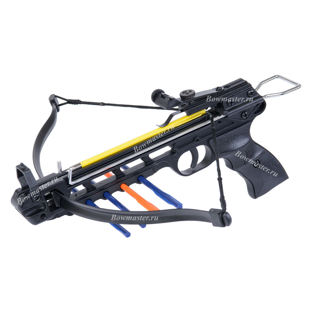 Этот материал, очень лёгкий, но прочный, активно используется в производстве метательного оружия. О том, что рукоятка будет скользить в руках и препятствовать комфортной и точной стрельбе обладателю 50А2 беспокоиться не следует. 50А2 оборудован стременной системой натяжения тетивы, классическим прицелом-мушкой для повышения точности, а кроме того, на него установлен надёжный принудительный предохранитель. Замок, а также механизм взвода, отлиты из стали. Под ложем располагаются специальные отверстия, в которых можно закрепить стрелы.